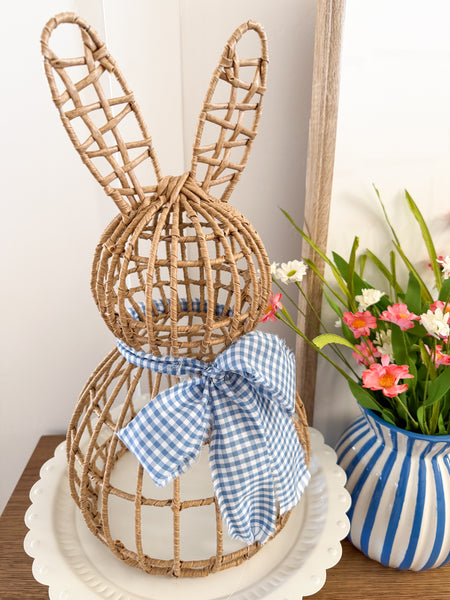 Add a soft pop of spring charm with our Bluebell Bunny. With a natural rattan-style finish and finished with a blue gingham bow, this bunny brings a fresh, cheerful touch to shelves, trays, and countertops. Perfect for Easter decorating or adding a hint of spring to your home.