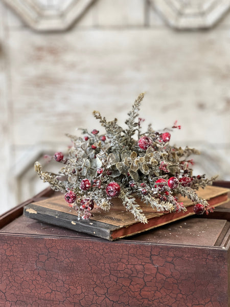 Icy eucalyptus foliage with showy red berries and a splash of small orbs makes a chilling collection with just the right amount of shimmer.