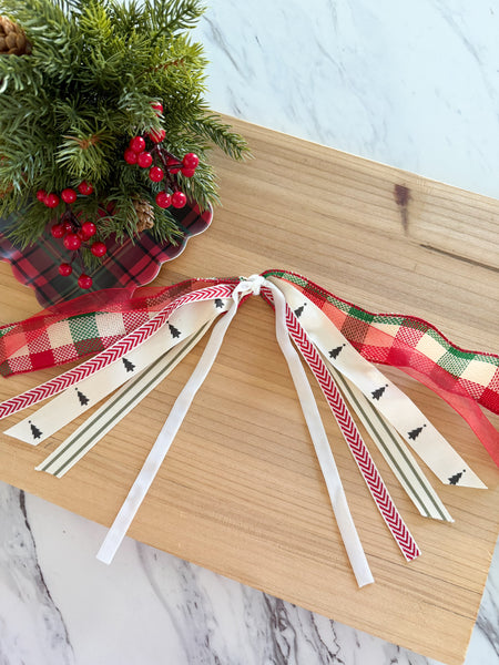 Each ribbon set is hand picked and cut for each customer. Approximate length for ribbon set is 20” total, 10” each side. Every ribbon set comes with a clip attached, making it easy to attach onto to any wreath.