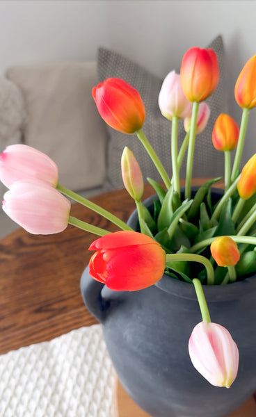 Transform your space with our tangerine Real Feel Tulip Bunch! With vibrant petals and lush green stems, these 16” long tulips provide a lifelike touch.