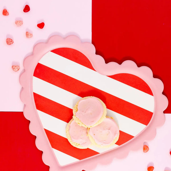 Sweeten up your Valentine's Day with our Scalloped Striped Heart Tray! Made from bamboo, this tray is perfect for serving snacks or displaying all your heart-shaped treats. Show some love with this unique scalloped design, guaranteed to make hearts flutter. • 15” x 13¾” bamboo shaped tray • Heart shaped • Food safe • Dishwasher safe • Eco-friendly and sustainable • Do not microwave
